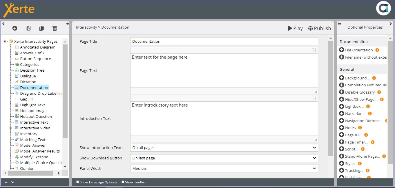 or view at Xerte Page Types > Interactivity: Documentation (opens in new tab).