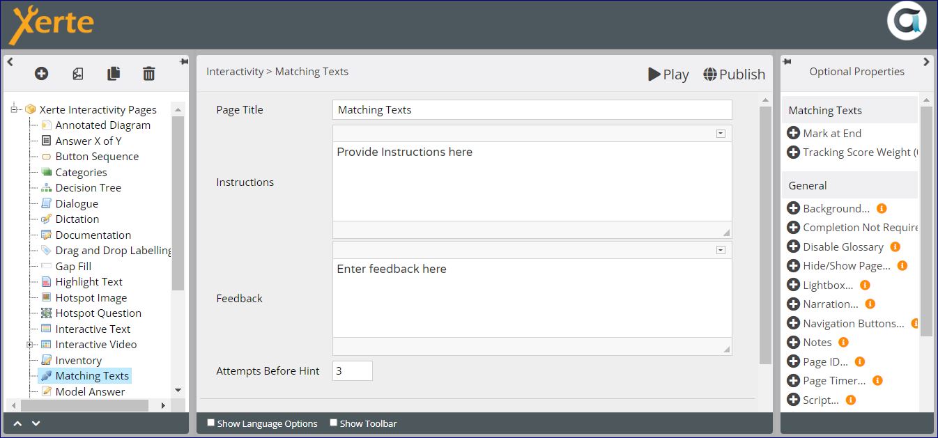 | Hint | A hint which appears after a set number of incorrect matches | Text+ (Toolbar) | Delete the default text if you do not want to use a hint. |