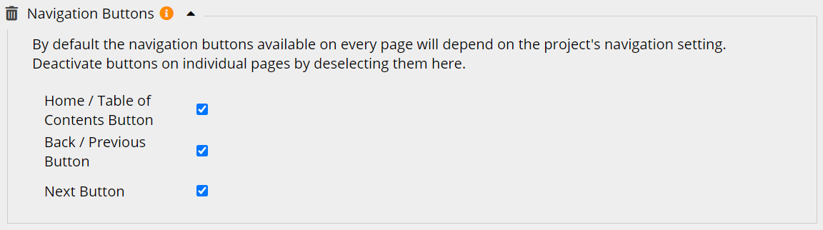 By default the navigation buttons available on every page will depend on the project's navigation setting. Deactivate buttons on individual pages by deselecting them here.