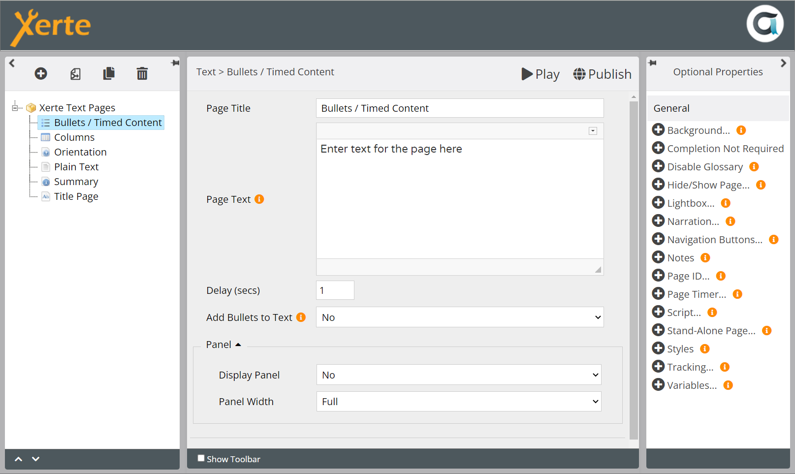 | Page Text | Content that appears in main page area | Text+ (Toolbar) | Each paragraph and bullet point (including numbered list, sub-list items and images) will appear separately at timed intervals on the screen. Apply bullets/numbers to selected text using the toolbar buttons. |