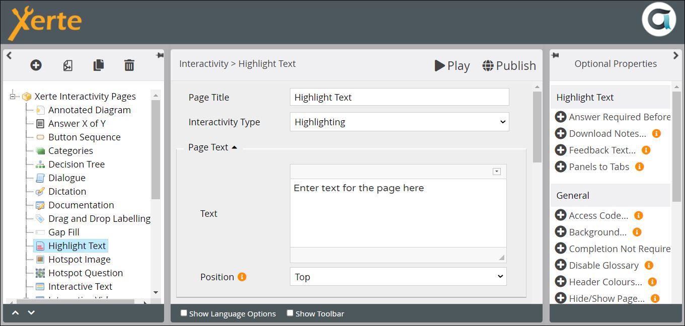 | Feedback Text: | Location of the Feedback tab and text {Panel 1/Panel 2} | Drop-down | This really needs to be in a different panel to the Initial Text, so that the learner's submitted highlighting and any model answer can be viewed side by side |