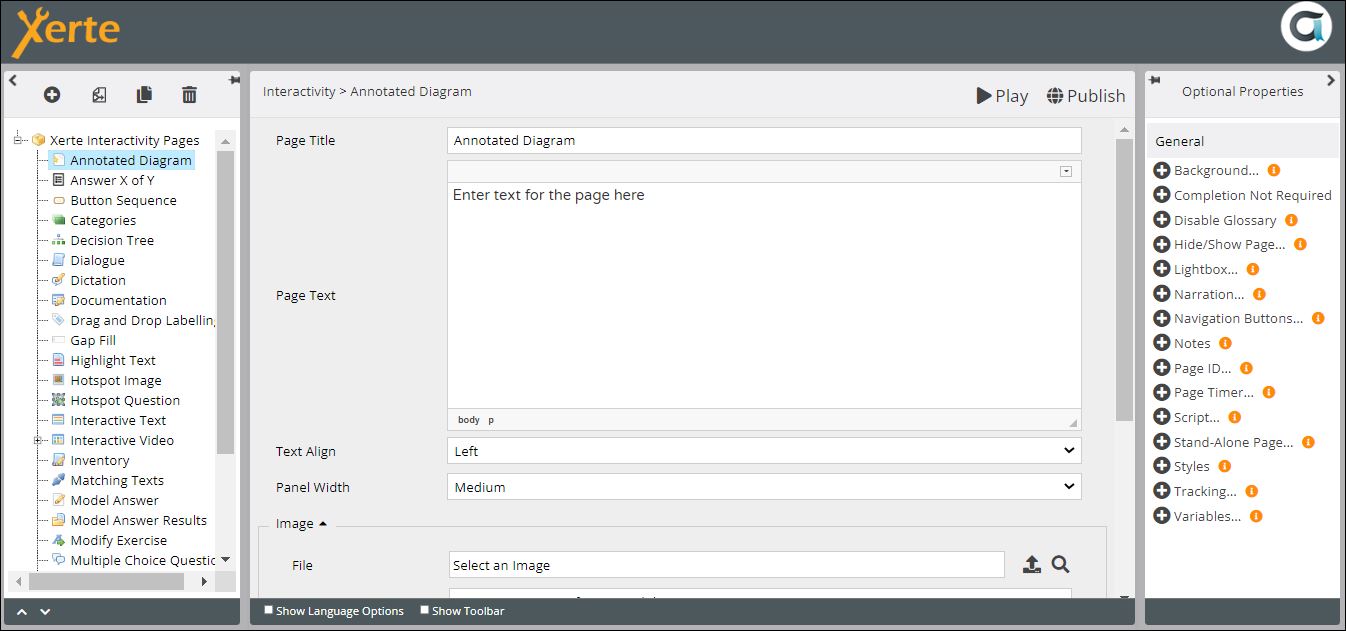 | Page Text | Content that appears at the top of the page | Text+(Toolbar) | Use this to give the context or instructions for the task. Other content (e.g. images, audio, video) can be embedded here. |