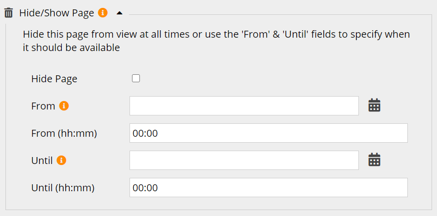 | Until | Date to make page hidden | Date | Use the calendar to select a date (format YYYY-MM-DD) |
