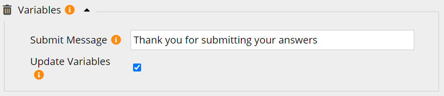 | Submit Message | Message to display after variable values submitted {Thank you for submitting your answers} | Text | Message shown after new variable values are submitted by the end user |