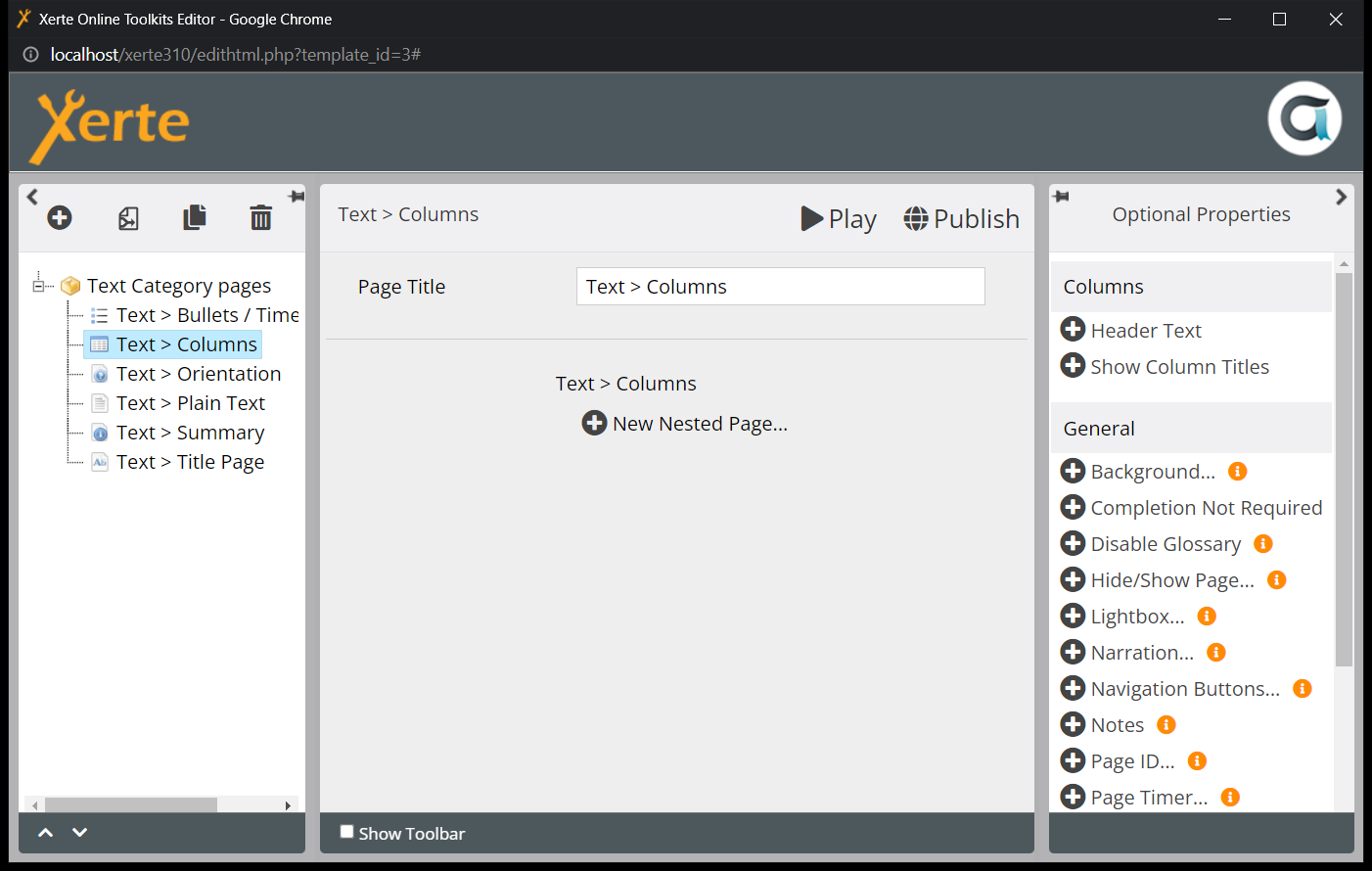 | Title | A label that appears in the project structure. If you add Show Column Titles from the Main Pane Optional Properties, these can be visible to learners. | Text | |